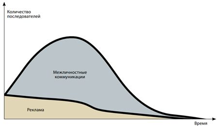 Если проводить систематизацию моделей, то можно отметить, что современные социальные коммуникации могут быть фактически объяснены комбинацией двух моделей – моделью П. Лазарсфельда и моделью Ф. Дэнса. Подтверждение этому можно найти в модели Фрэнка Басса, который описывал изменение числа последователей во времени в зависимости от разных типов коммуникаций при диффузии инноваций (см. рисунок 6) [9].