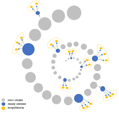 В ранее проводимых исследованиях (см. рисунок 8) учитывалась особенность коммуникации через лидеров мнений в рамках маркетинга влияния, однако она не учитывала сохранение традиционных коммуникаций, отмеченных в модели П. Лазарсфельда.