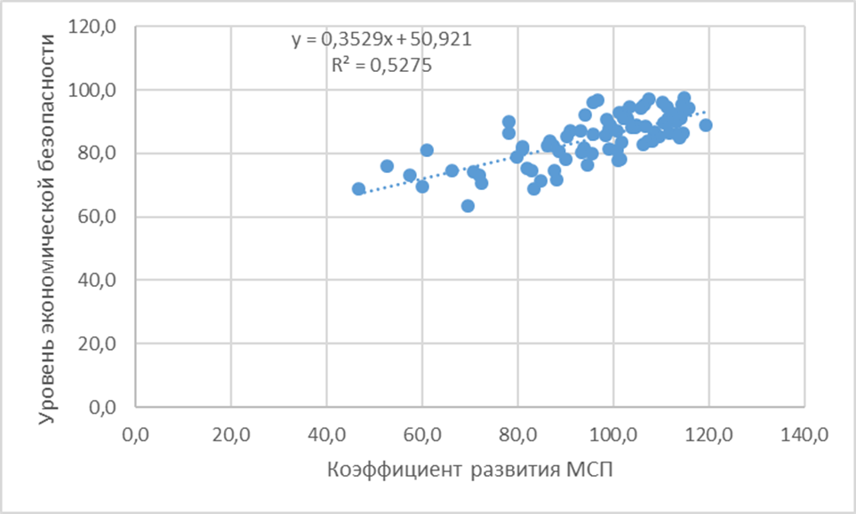 Научная новизна исследования заключается в разработке авторского интегрального коэффициента развития МСП региона, учитывающий не только средние значения показателей, но и их вариабельность во времени, позволяющий проводить межрегиональные сопоставления. Кроме того, на основе открытых данных автором доказано наличие сильной взаимосвязи между малым и средним предпринимательством и экономической безопасностью регионов России.