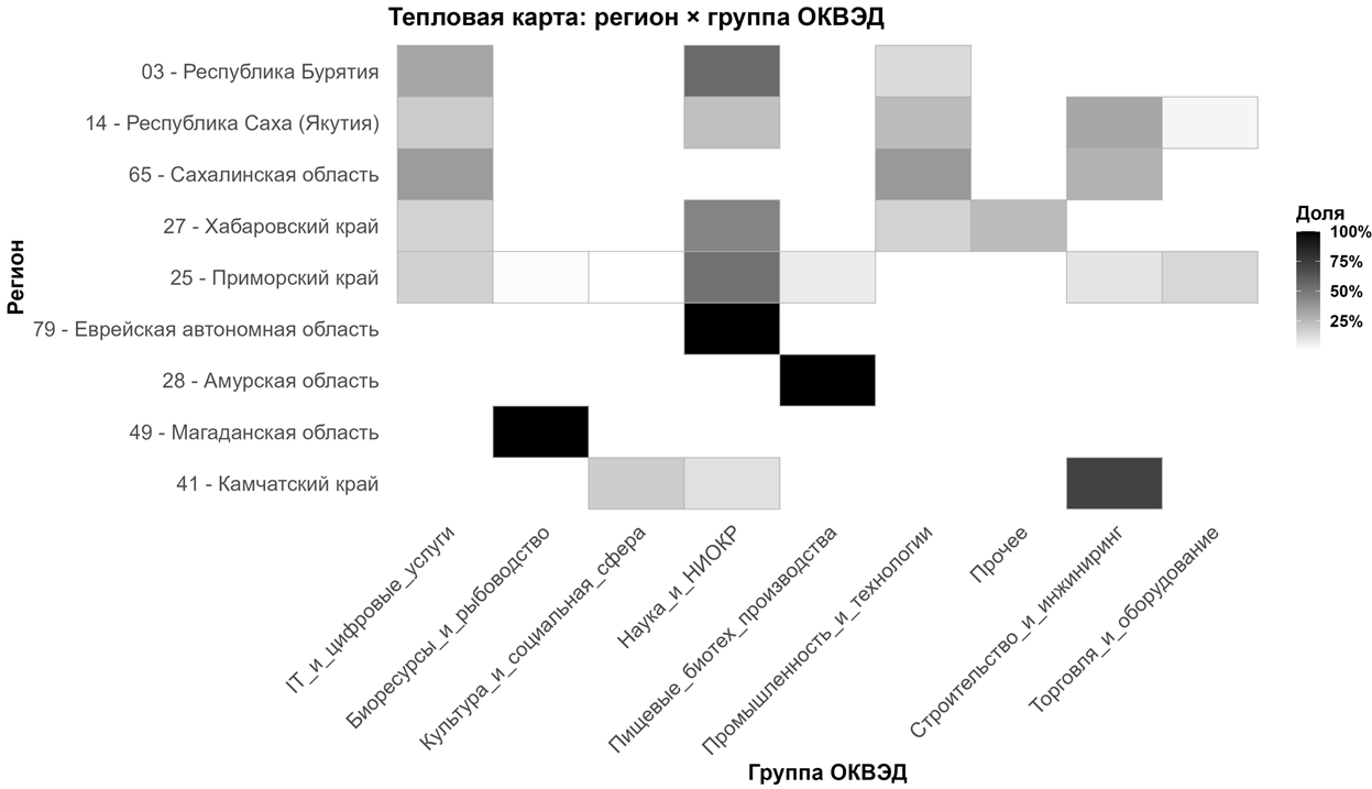 Еврейская автономная область при общем объёме поддержки 4,0 млн руб. полностью сосредоточена на науке и НИОКР, что делает её предельно концентрированным регионом. Амурская область имеет 24,0 млн руб. поддержки, полностью сконцентрированной в пищевых и биотехнологических производствах, а Магаданская область — 3,0 млн руб., полностью сосредоточенных в биоресурсах и рыбоводстве. Эти регионы представляют собой эмпирически чистый тип моноспециализированной периферии.
