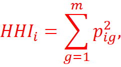 Для количественной оценки степени отраслевой концентрации распределения грантовой поддержки в исследовании использовался индекс Херфиндаля–Хиршмана. Расчёт индекса осуществлялся на основе долей укрупнённых групп ОКВЭД в совокупном объёме поддержки соответствующего региона. Формально показатель определялся как сумма квадратов долей отдельных групп: