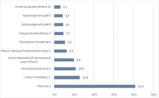 Эффективность экономики обуславливается динамикой валового регионального продукта региона (далее – ВРП). ВРП Югры растет. За 2024 год округ по объему ВРП находится на четвертом месте после Москвы, Санкт-Петербурга, Московской области соответственно (рис. 1.).