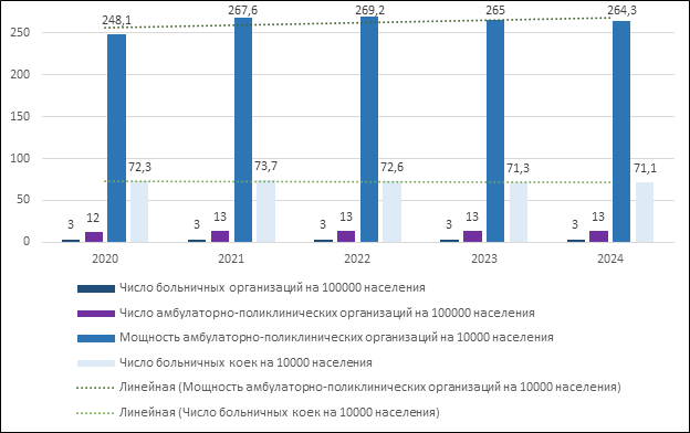 По данным статистики медицинских организаций число больничных организаций, амбулаторно-поликлинических организация на 100 тыс. населения за период 2020-2024 гг. остается неизменным. Мощность амбулаторно-поликлинических организаций к 2022 году росла, затем началась снижаться. Также наметилась тенденция к снижению числа больничных коек.