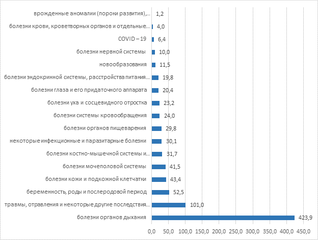 К показателям здоровья также относим структуру заболеваемости. Она приведена на рис. 5. Здесь очевидна значительная доля болезней органов дыхания (превышение среднероссийского показателя – на 1%), а также травм (превышение среднероссийского показателя – на 6%).