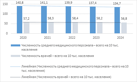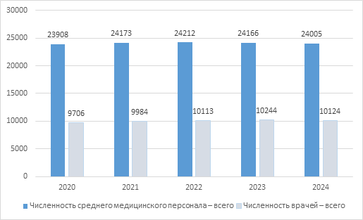За пятилетний период, с 2020 г. по 2024 г., в абсолютном выражении численность врачей и среднего медицинского персонала (далее – СМП) показывает относительную стабильность и даже небольшой прирост до 2024 года (рис. 6).
