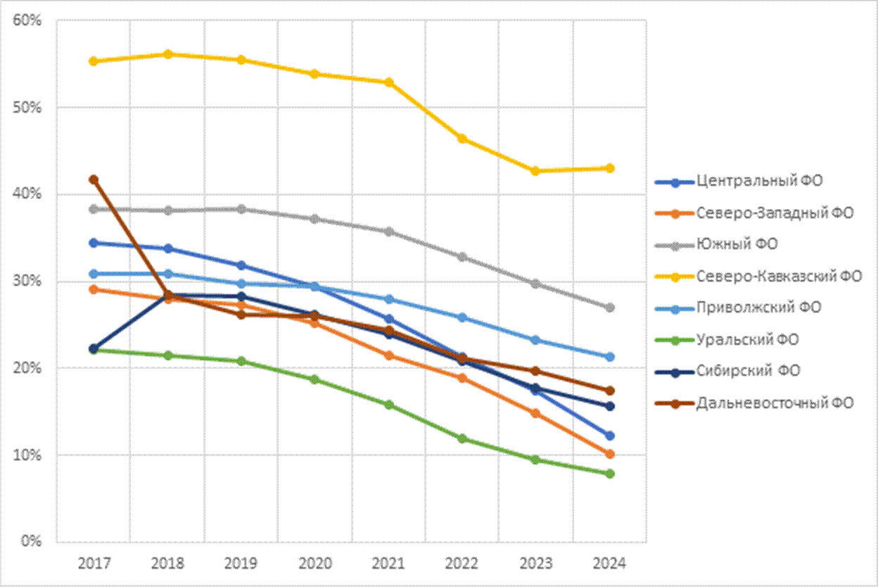 Анализ статистических данных Росстата демонстрирует глубокую региональную дифференциацию. Расчеты на базе данных в разрезе субъектов РФ показали, что Северо-Кавказский ФО остаётся абсолютным лидером с критически высоким показателем в 43,0%, что почти в 2,5 раза превышает среднероссийский уровень. Южный ФО демонстрирует второй по величине уровень — 27,1%, что остаётся выше среднего. Приволжский ФО находится на уровне 21,4%, Сибирский ФО — 15,7%, Дальневосточный ФО — 17,5%. Промежуточное положение занимают Центральный (12,3%), Северо-Западный (10,2%) и Уральский (7,9%) округа, которые демонстрируют наиболее успешные результаты в формализации занятости (рис. 2). Наличие подобной разницы (более чем в 5 раз) говорит о значительном варьировании условий формальной занятости и структуры экономики по территории России. Тем не менее, динамика показателей за период 2017-2024 годов свидетельствует о схожих тенденциях между федеральными округами. Каждый демонстрирует сокращение уровня неформальной занятости (рис. 3).