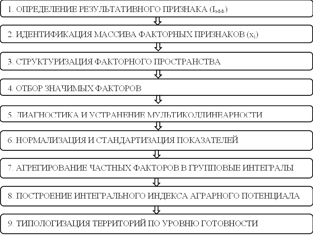 Методология исследования базируется на системно-функциональном подходе, который позволяет рассматривать сельские территории не изолированно, а как элементы единой аграрно-экологической системы региона. Исследование ориентировано на преодоление фрагментарности управленческих решений и переход от унифицированных стратегий к дифференцированному управлению, учитывающему реальную готовность конкретных территорий к аграрно ориентированному развитию. В качестве основного направления развития исследования принята логика последовательной типологизации: от идентификации факторов аграрного потенциала – к оценке динамической эффективности – к группировке территорий – и далее к формированию адаптированных стратегических приоритетов и инструментов.