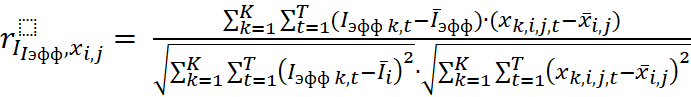 Отметим, что в отличие от классических подходов к оценке аграрного потенциала территории, где результативным признаком выступает валовой объем производства (y), в разработанной нами методике предлагается использовать композитный показатель динамической эффективности (Iэфф). В качестве него будет выступать интегральный индекс, учитывающий не только объем производства сельскохозяйственной продукции, но и его прирост, и эффективность использования ресурсов, а именно показатель землеемкости в стоимостном выражении. Таким образом, композитный показатель динамической эффективности можно определить по формуле (1):