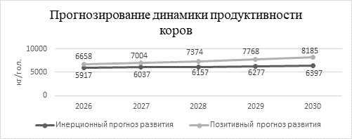 Инерционный сценарий предполагает рост удоя с 5917 кг/гол. в 2026 г. до 6397 кг/гол. в 2030 г. при среднегодовом приросте около 1,3%. Позитивный сценарий отражает переход к интенсивной модели: продуктивность увеличивается с 6658 до 8185 кг/гол., а ежегодные темпы прироста составляют 5,2-6,1%. Реализация данного варианта требует комплекса мер – внедрения инноваций, селекционной работы, оптимизации кормления и модернизации содержания.