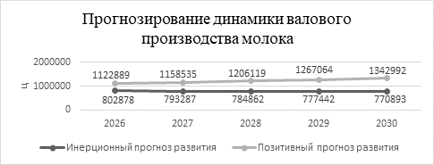 Инерционный сценарий характеризуется устойчивым сокращением валового производства: ежегодные темпы снижения составляют 1-2%, а к 2030 году объем уменьшится на 32 тыс. ц относительно уровня 2026 года. Позитивный сценарий, напротив, предполагает выраженный рост с постепенным ускорением (от 3-4% в начале периода до 6-7% в конце), что обеспечит прирост более 220 тыс. ц к 2030 году. Достижение данного варианта требует комплекса мер: внедрение современных технологий, улучшение генетического потенциала стада, оптимизация кормления и содержания, а также государственная поддержка.