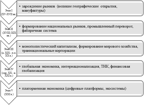 Четвертый этап (середина XX — начало XXI века) — глобальная экономика. Научно-техническая революция, развитие транснациональных корпораций, финансовая глобализация и региональная интеграция формируют единое мировое хозяйство. Возникают глобальные цепочки создания стоимости, где координация осуществляется как через рыночные механизмы, так и через внутрикорпоративные иерархии [16, с. 394] (Smith A., 2007) . Информационные технологии начинают играть все более важную роль, подготавливая почву для следующего этапа.