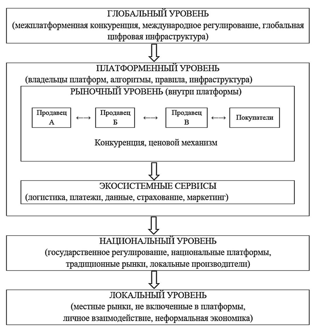 2. Национальный уровень включает традиционные регулируемые рынки, национальные платформы (например, Яндекс в России), государственные информационные системы, а также сегменты экономики, где платформы ещё не доминируют.