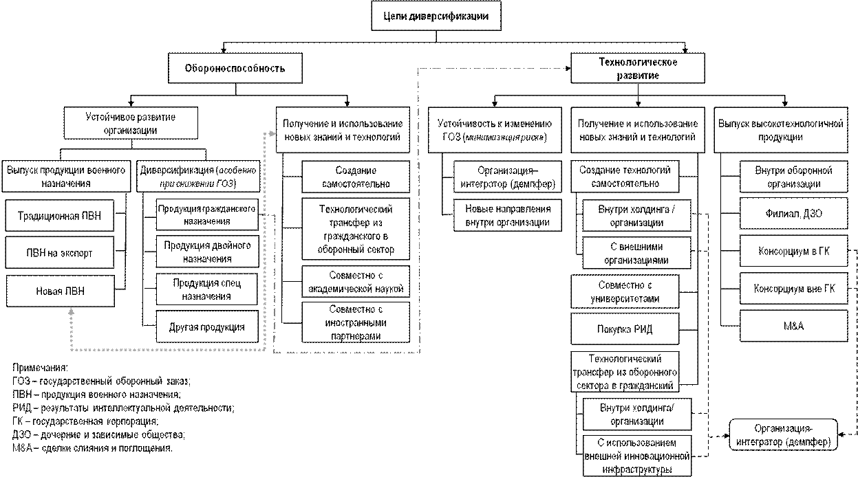 В рамках статьи сделана попытка составить дерево целей и задач, исходя из понимания диверсификации, которое складывается к настоящему времени и подтверждается деятельностью основных акторов оборонного сектора – государственных корпораций и холдингов, объединяющих оборонные организации («Ростех», «Росатом», «Роскосмос»).