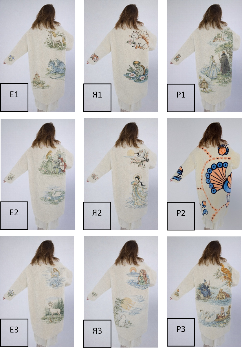 Из девяти использованных изображений только одно являлось реальным дизайнерским объектом (см. рис. 1, поз. Р2), остальные были созданы с использованием ChatGPT 5.2 (модуль генерации изображений) на основе текстовых промптов, жестко задающих единые параметры визуального представления: иллюстративную манеру, декоративный характер, музейную стилистику, сопоставимую цветовую палитру и композиционную плотность. Цель использования нейросети заключалась в обеспечении формальной однородности изображений, необходимой для корректного экспериментального сравнения. Такой подход позволил минимизировать влияние индивидуальной авторской манеры и технических особенностей изображений, сосредоточив анализ на культурно-семиотическом содержании визуальных образов.