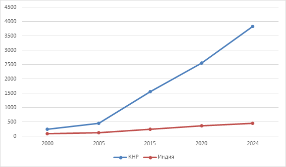 Рис. 2. Производство электроэнергии из низкоуглеродных источников в КНР и Индии в период 2000-2024 гг. (TВт ч)