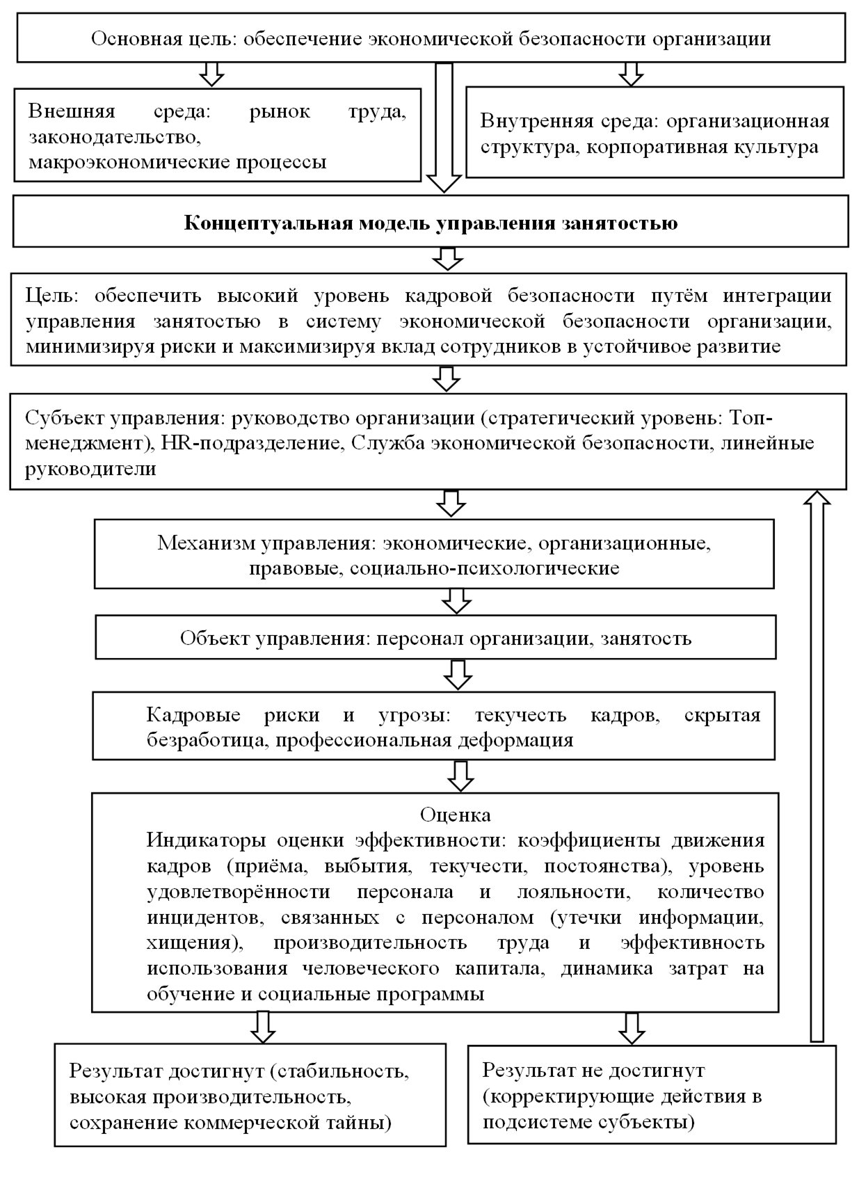 Стоит отметить, что Концептуальная модель управления занятостью в системе экономической безопасности организации представляет собой интегрированный комплекс, в котором функциональные процессы управления сотрудниками (планирование, рекрутмент, стимулирование, мониторинг и развитие) носят целенаправленный характер и ориентированы на минимизацию кадровых рисков и угроз. Такое функциональное подчинение гарантирует стабильность и устойчивость экономического субъекта от дестабилизирующих факторов внутренней и внешней среды.