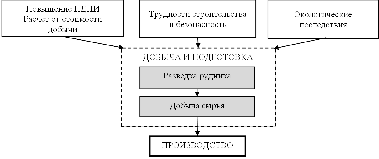 Рисунок 1. Производственный цикл в отрасли калийных удобрений. Этап добычи и подготовки
