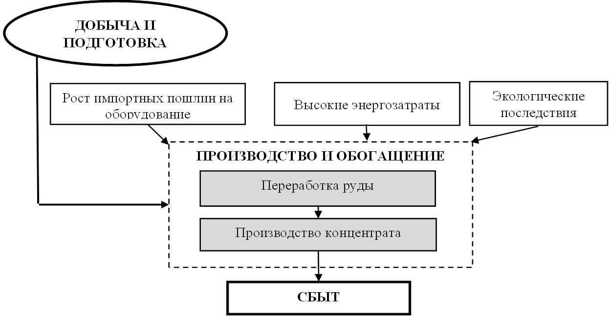Стадия переработки добытой руды в товарный концентрат (рис.2) сопряжена с рисками, влияющими на себестоимость и технологическую устойчивость производства. Сохраняется значимость экологических обязательств, связанных с утилизацией отходов обогащения. При этом усугубляющим фактором является зависимость от импортного оборудования, в связи с чем риски роста ввозных пошлин и ограничений на его поставку напрямую воздействуют на производственные издержки и возможности модернизации. Дополнительное давление оказывает устойчивая тенденция к росту энергоемкости процессов, что повышает уязвимость предприятий к колебаниям тарифов на энергоносители.