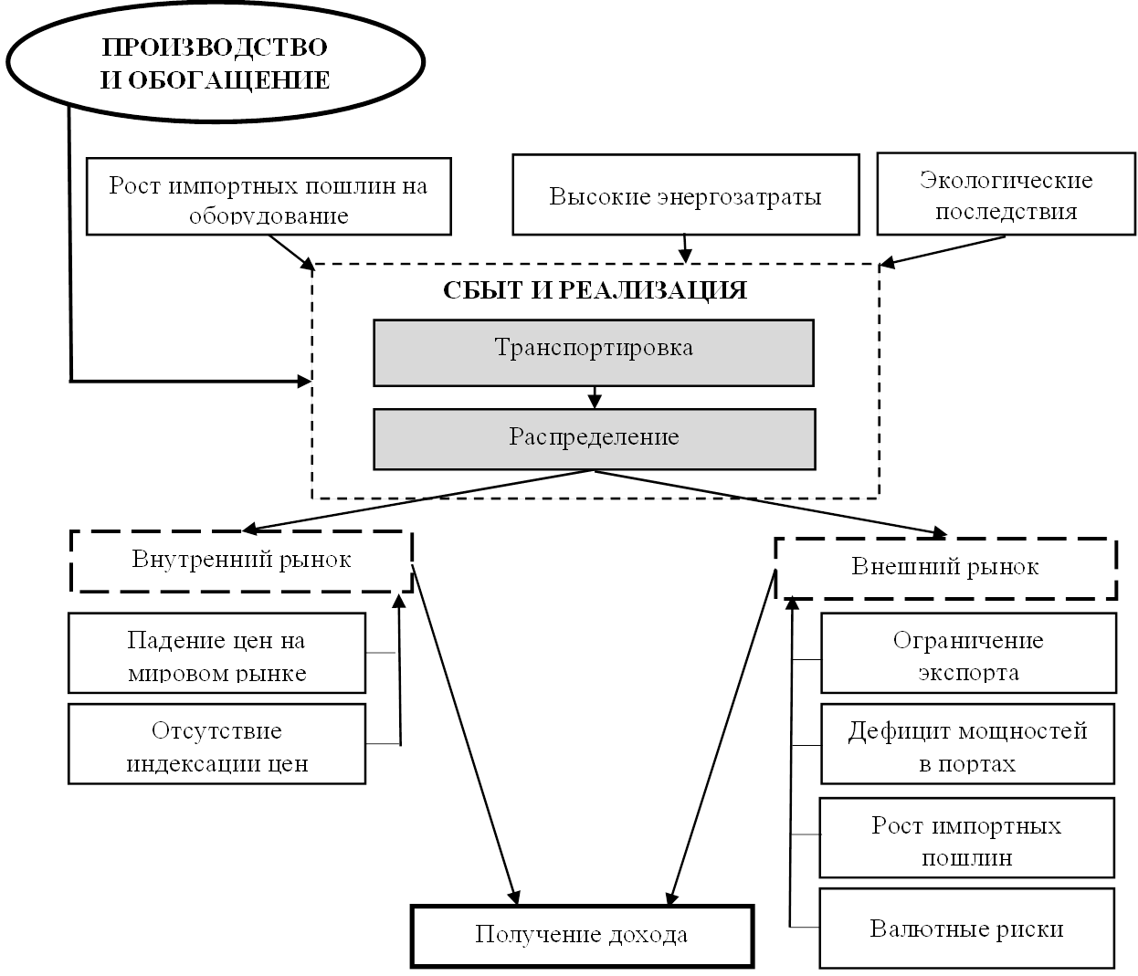 На последующем этапе реализации (рис. 3) компания сталкивается с двумя группами рисков, разделенными по рынкам сбыта. На внутреннем рынке основная проблема — регуляторные ограничения, такие как отсутствие индексации цен, что сдерживает рост выручки. На внешнем рынке риски более многообразны: падение мировых цен, ограничения экспорта, дефицит портовых мощностей, рост импортных пошлин в странах-покупателях и валютные риски [7].