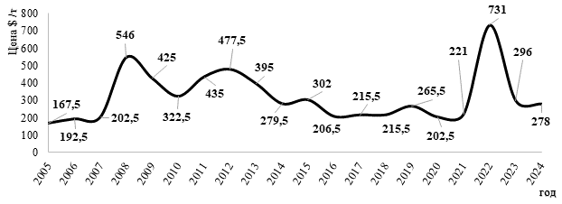 Рисунок 5. Динамика мировых цен на хлорид калия с 2005 по 2024 годы