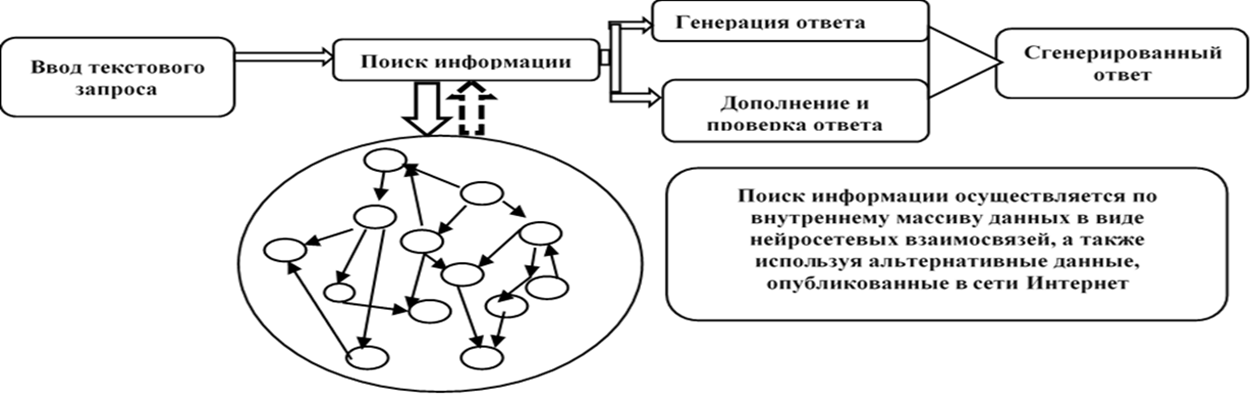 На основе механизма, представленного на рисунке 1, были разработаны модели Chat GPT-2 и Chat GPT-3. Суть представленных моделей составляет поиск, аккумуляция, генерация информации по средствам постоянного обучения моделей по загружаемой в них информации и текстовых запросов, представленных пользователями. При этом качество сгенерированных ответов зависит от «Prompt», которые применяют пользователи при написании текстового сообщения (запроса). Каждый запрос остается в объеме памяти больших языковых моделей, таким образом обеспечивая их развитие и обучаемость [19].