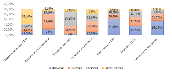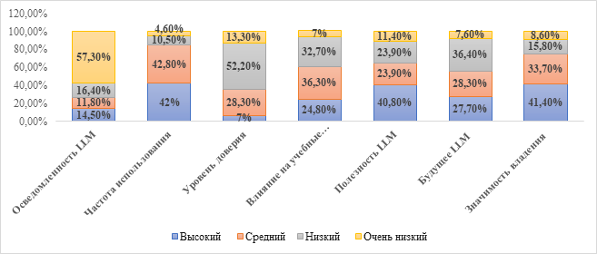 Результаты проведенного опроса показывают, что академическая честность среди всех опрошенных студентов является наименьшем по значимости фактором, определяющем степень доверия при использовании LLM моделей. При этом их мнение о их роли в образовательном процессе солидарно: LLM модель рассматривается лишь как вспомогательное средство, дополняющее учебный процесс и преподавателя.