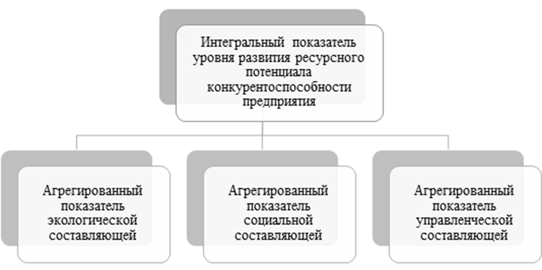 Для построения интегрального показателя уровня развития ресурсного потенциала конкурентоспособности предприятия используется аддитивная свертка агрегированных показателей экологической, социальной и управленческой составляющих: