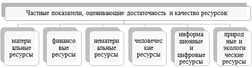 Важным аспектом управления конкурентоспособностью предприятия является оценка уровня развития ее ресурсного потенциала. На рисунке 3 представлена модель оценки уровня развития ресурсного потенциала конкурентоспособности предприятия на основе концепции ESG. Данная модель носит универсальный характер и может быть применена для любого предприятия, вне зависимости от размера, вида экономической деятельности, формы собственности и других аспектов. Однако, состав частных показателей, определяющих достаточность и качество всех видов ресурсов для формирования конкурентных преимуществ, улучшения конкурентных позиций на рынке, будет зависеть, прежде всего, от сферы деятельности предприятия.