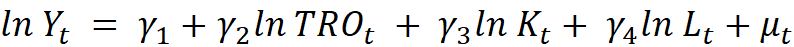 where TRO denotes trade openness and is calculated as the total foreign trade turnover (the sum of exports and imports) divided by GDP, expressed as percentage. For the purpose of this study, TRO is used simply as the integer value of the percentage. The theoretical justification behind this specification of the technology index is that trade openness promotes transfer of knowledge, skills and technology spillovers and hence fosters economic growth [2].