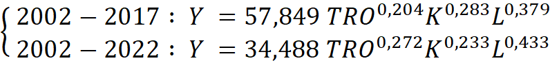 Based on the estimations for the period 2002-2017 conclusion can be made that a 1% increase in labor costs would result in 0,379% increase in output ceteris paribus. The same 1% increase in capital and trade openness would result in 0,283% and 0,204% increase in output ceteris paribus respectively. This indicates that the output responsiveness to changes in labor costs was the highest, and in trade openness the lowest during this period. However, estimation of the production function for the full period 2002-2022 demonstrates that some changes have happened since 2017. A 1% increase in labor costs would result in 0,44% increase in output ceteris paribus. A 1% increase in trade openness and capital would result in 0,27% and 0,23% increase in output ceteris paribus respectively.
