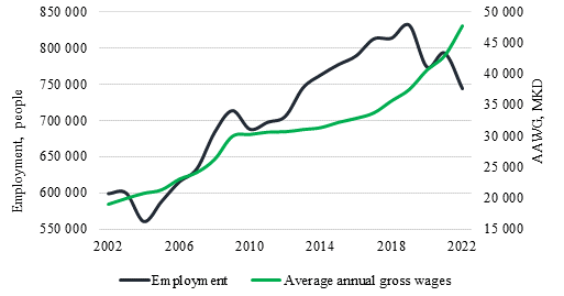 Figure 1. Employment and average annual gross wages in North Macedonia 2002-2022