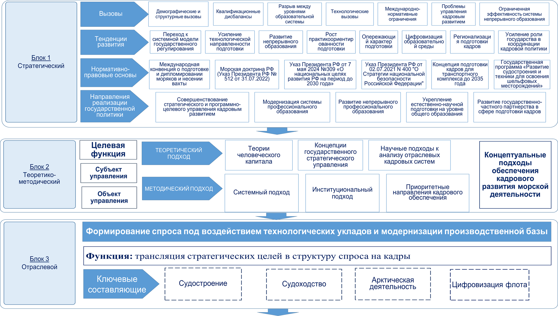 В структуре блока разграничены субъект и объект управления: субъектом является система государственного и отраслевого регулирования, объектом — кадровый потенциал морской сферы как совокупность компетенций и механизмов их воспроизводства.