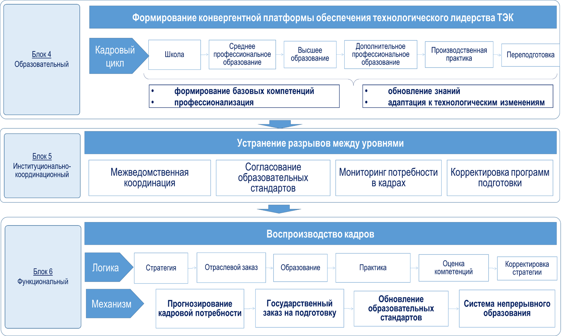 Блок 6. Функциональный блок отражает операционную логику воспроизводства кадрового потенциала морской деятельности. Он раскрывает механизм преобразования стратегических приоритетов и отраслевого спроса в результаты подготовки и использования кадров.