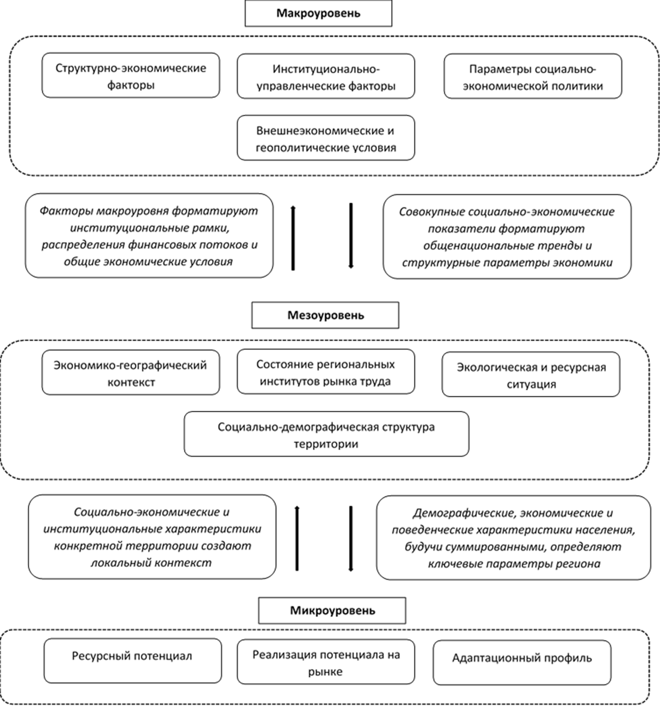 • Мезоуровень – региональные и локальные условия, опосредующие влияние макрофакторов и создающие специфический контекст для жизни домохозяйств;