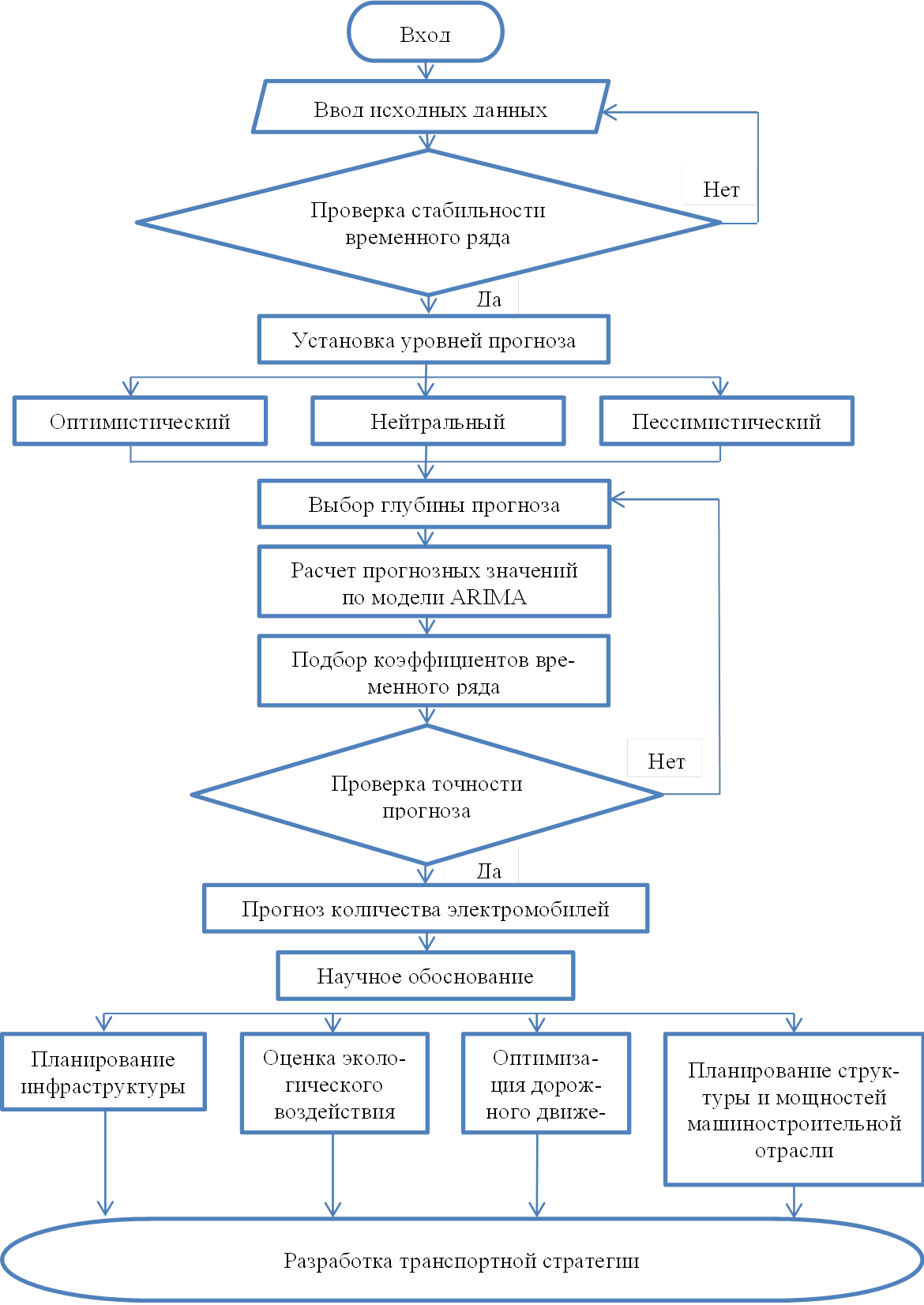 В рамках данного исследования использование модели ARIMA для прогнозирования количества зарегистрированных электромобилей и автомобилей с гибридной силовой установкой позволяет получить более точные и обоснованные прогнозы по трем направлениям, которые позволят выстроить грамотную стратегию с учетом феномена неопределенности и нестабильности внешней среды: оптимистический прогноз, наиболее реалистичный (нейтральный) и пессимистический вариант, их характеристика представлена в таблице 1. Программный код для реализации модели прогноза был составлен на языке Python в программном продукте Jupyter Notebook. Общая схема программного кода имеет вид алгоритма, отражающего логическую последовательность составления прогноза (рис. 1). Проверка заданных условий осуществляется программным модулем автоматически, таким образом формируется качественная база репрезентативных прогнозных значений, которые далее могут быть применены для научного обоснования решений, закладываемых в стратегии развития транспорта и промышленности.
