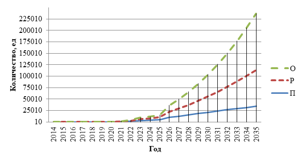 Исходные данные и результаты прогноза по наличию электромобилей по Российской Федерации в целом сведены в таблицу 2.